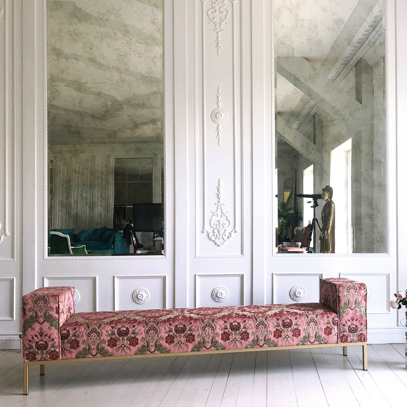 Upholstered sofa with animal style velvet silk fabric by Veraseta and used look metal baseframe.