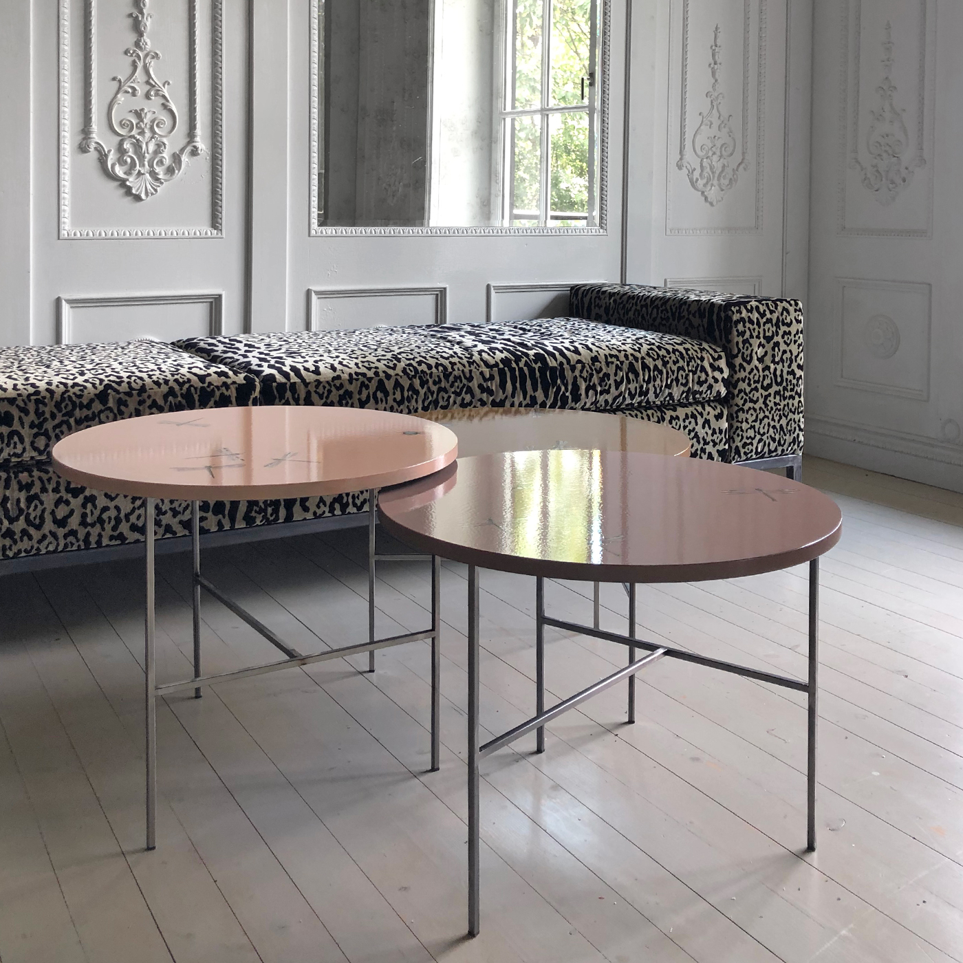 Elegant coffee table set with hand painted wooden table tops and filigree welded metal frame.