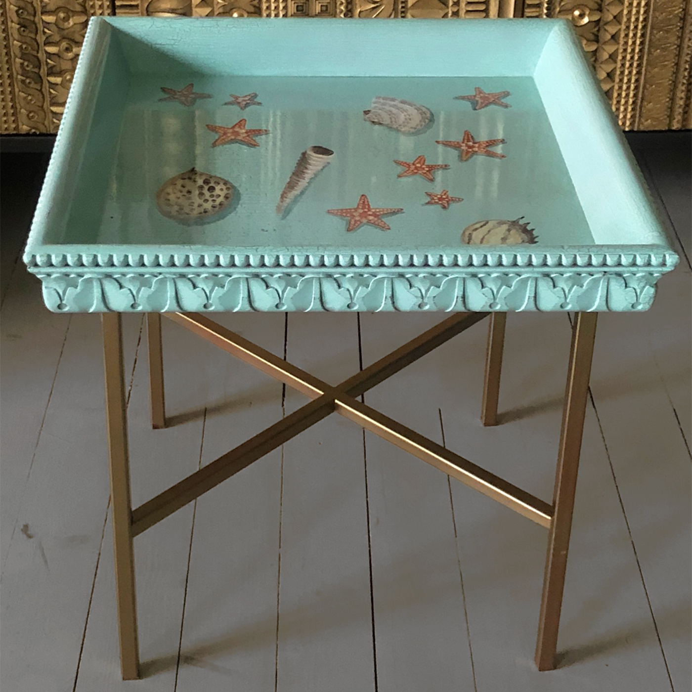 Beautiful gold leaf serving trays with elaborate hand painted designs and a matching metal frame..