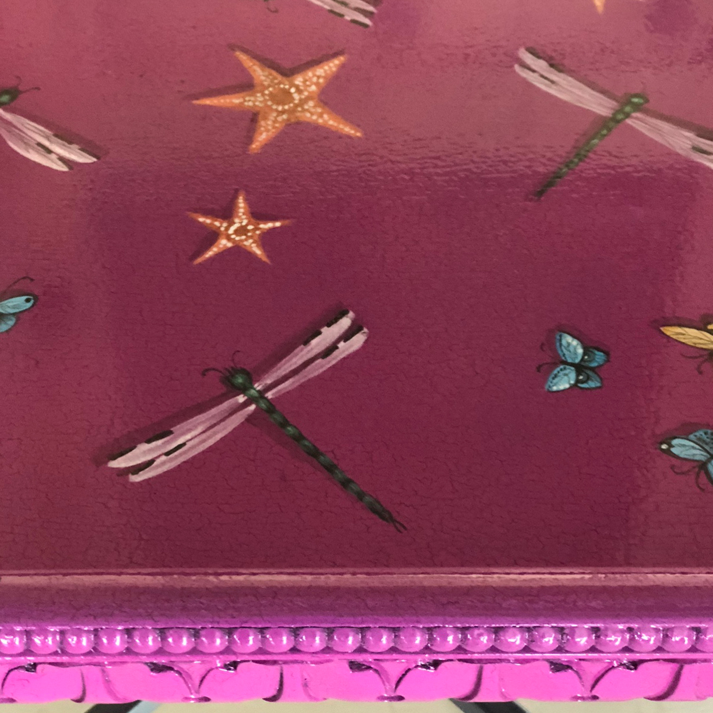 Coffee tables with fancy vintage look, upholstered with vintage fabrics and decorated with color matching studs.